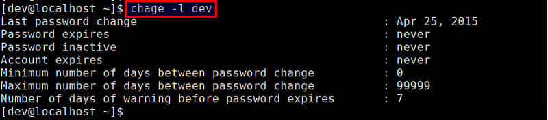要查看特定用户的过期信息(比如:alice),运行下面的命令。注意的是除了你自己之外查看其他任何用户的密码信息都需要root权限。