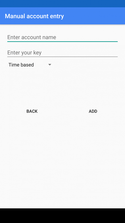 现在你已经配置好了用户 jack。在设置用户 olivia 之前,你需要在 Google 身份验证器应用上为 jack 添加账户(LCTT 译注:实际操作情形中,是为 jack 的手机上安装的该应用创建一个账户)。在打开应用,点击“菜单”按钮(右上角三个竖排点)。点击“添加账户”然后点击“输入提供的密钥”。在下一个窗口(图1),你需要输入你运行 google-authenticator 应用时提供的 16 个数字的密钥。给账户取个名字(以便你记住这用于哪个账户),然后点击“添加”。